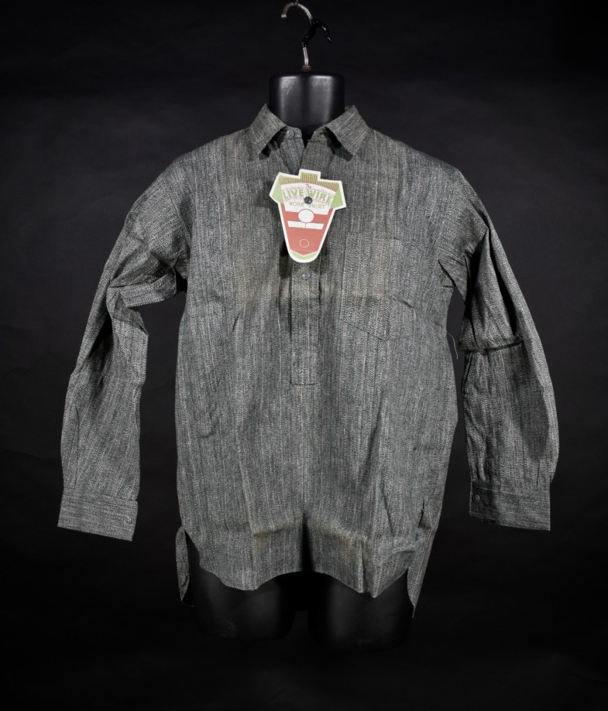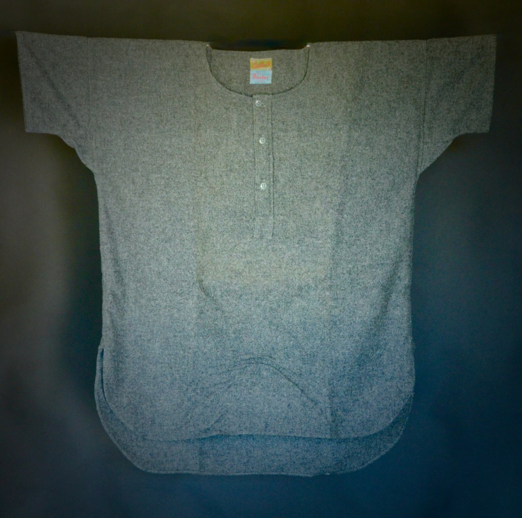 what is actually interesting is the fabric, and the style, these pieces are still sought after as a piece of contemporary clothing because of their character. The two next images show this with both the style, and the texture of the fabric. The character of the long tail, when worn outside or over pants, and the button panel finishing halfway down the shirt.